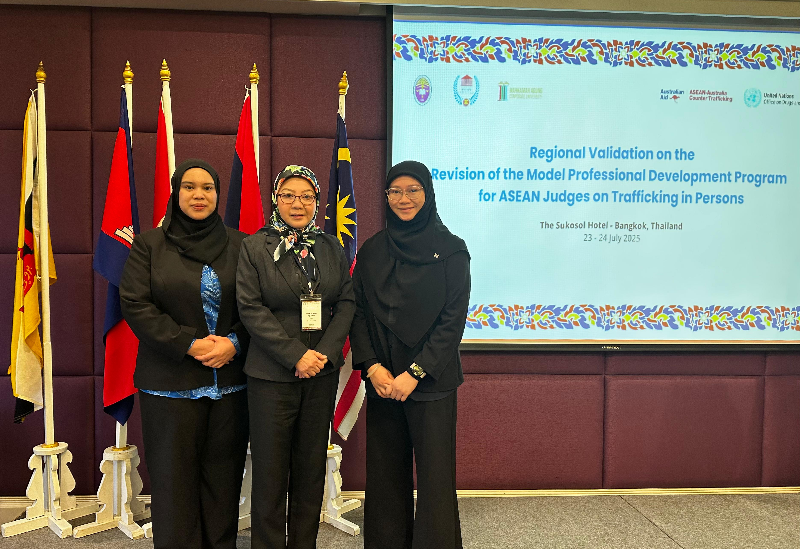 Representatives from the Supreme Court of Brunei Darussalam attended the Regional Validation Workshop on the Model Professional Development Program for ASEAN Judges in Trafficking in Persons (TIP), held from 23 to 24 July 2025. The workshop marked the second part of a two-phase effort to revise and update the Model Trafficking in Persons Program, originally developed in 2018 to ensure the effectiveness and continued relevance of the Model TIP Program.