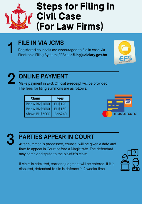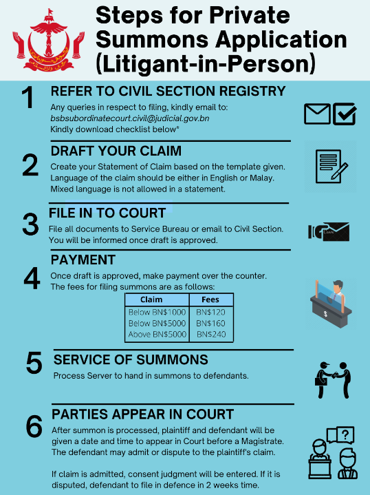 Unrepresented individuals / litigants-in-person may file their claim at the service bureau of the Magistrates’ court or email their documents to the civil section. You may download the checklist on the documents you are required to provide to the court. You will be informed once the writ of Summons and statement of claims have been approved.